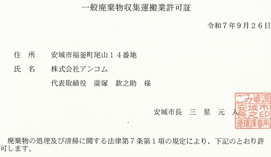 安城市の一般廃棄物収集運搬業許可証が新しくなりました。