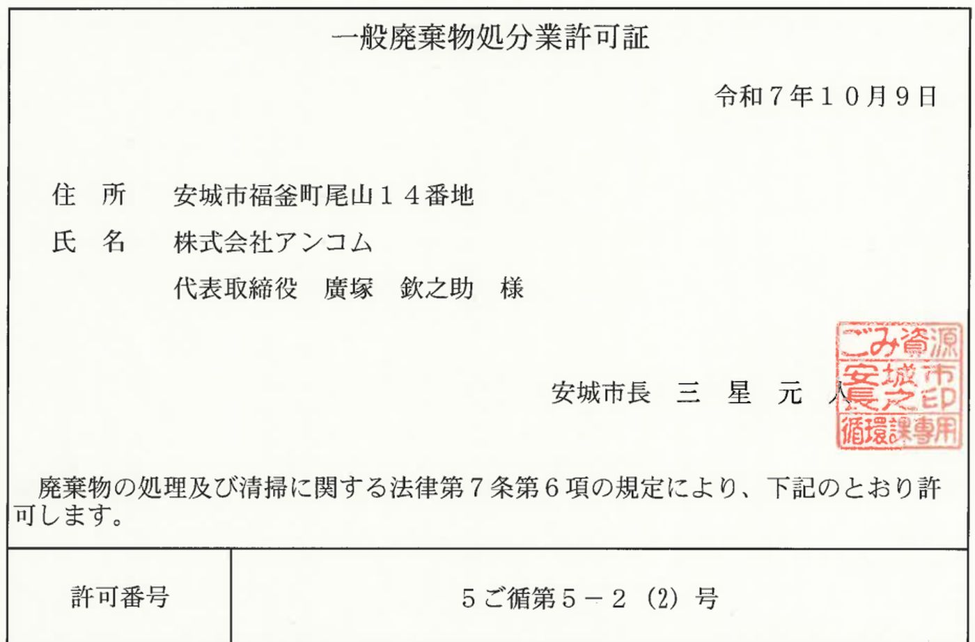 安城市の一般廃棄物処分業許可証が新しくなりました。